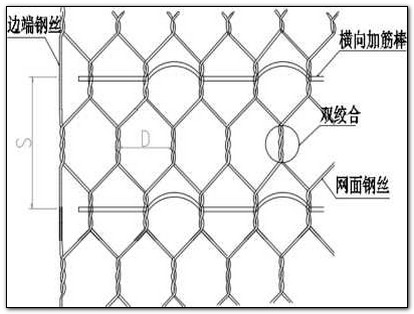注:钢丝的抗拉强度应在350~550N/m㎡,编织前钢丝延伸率不能低于8%,钢丝直径公差均指未拉伸前,横向加筋棒应编入双绞合钢丝之中,不能采用焊接固定或者钢丝进行绑扎固定,严禁采用电镀锌镀层钢丝。