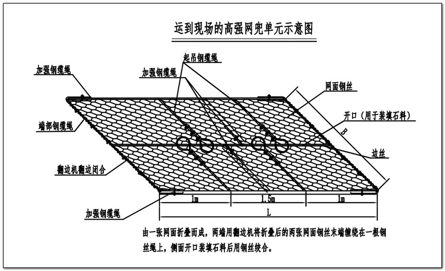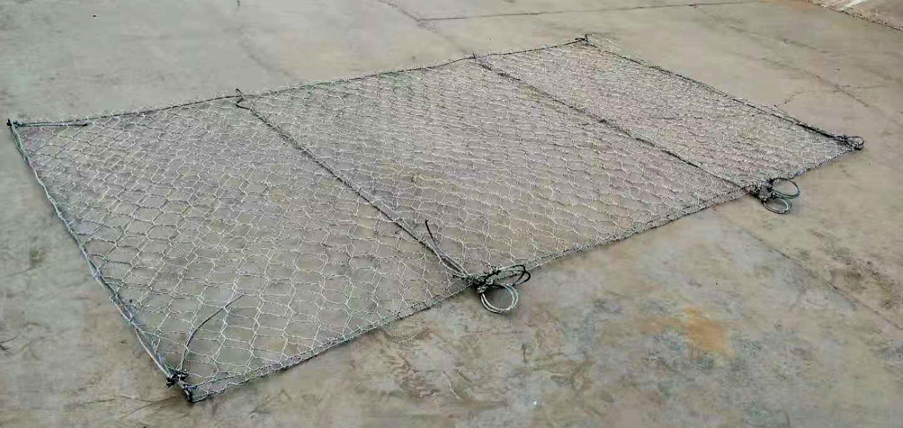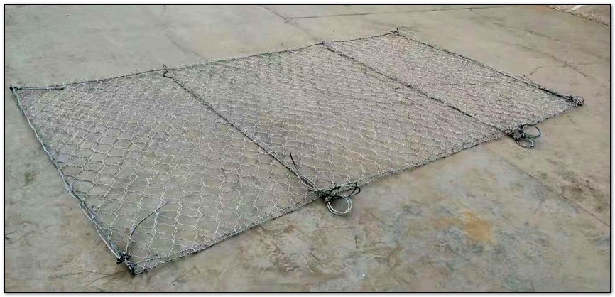1、赛克格宾是由经防腐处理的直径φ2.4mm的钢丝和一根直径Φ6mm的加强钢缆绳以双绞合的形式共同编织而成的六边形网孔复合柔性金属网,制作成符合要求的工程构件,网面由钢缆绳与钢丝同步编制而成,不得采用二次加工的方式将钢丝绳与成品钢丝网面连接,单个钢丝网将长边两侧往中间折叠形成3.5m×2m双层网面扁平结构,网孔一般设计为8×10cm或10×12cm。网面两端分别用翻边机将折叠后的两张网面钢丝末端缠绕在顶部钢缆绳上。